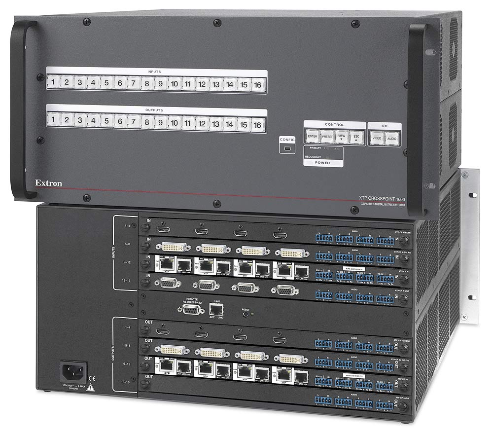 Extron XTP CrossPoint? 1600 在本地和遠(yuǎn)程終端之間提供了靈活、可靠的數(shù)字和模擬視頻切換和分配。此模塊化矩陣切換器使用多種可選擇的輸入和輸出板,尺寸可配置為 4x4 至 16x16 不等。它可通過單根 CATx 屏蔽電纜將高分辨率視頻、音頻、RS-232、以太網(wǎng)信號和電源發(fā)送至 100 m 的遠(yuǎn)端 XTP? 發(fā)送器和接收器,還能通過光纖傳輸更遠(yuǎn)的距離。XTP CrossPoint 1600 也支持 HDMI、DVI、VGA、視頻和音頻與本地信號源和顯示設(shè)備的直連。XTP Systems? 具有超快的數(shù)字視頻切換和先進(jìn)的系統(tǒng)監(jiān)控功能,可提供穩(wěn)定的信號路由和高可靠性。