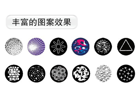 1個(gè)固定圖案盤,1個(gè)旋轉(zhuǎn)圖案盤,16個(gè)可更換圖案片,可安裝玻璃圖案片和金屬圖案片,可雙向變速旋轉(zhuǎn),具索引功能、變速抖動(dòng)效果、雙向變速流動(dòng)效果