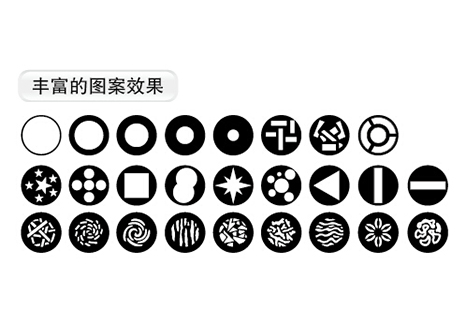 1個固定圖案盤,17個固定圖案+白光,1個旋轉(zhuǎn)圖案盤,9個可更換自轉(zhuǎn)圖案+白光,具有變速抖動效果、雙向變速流動效果