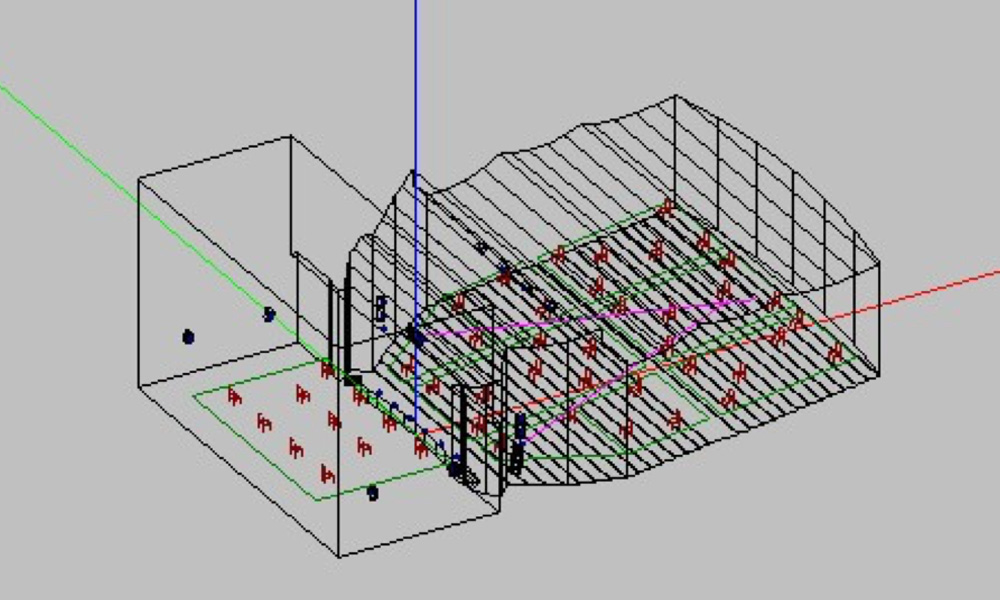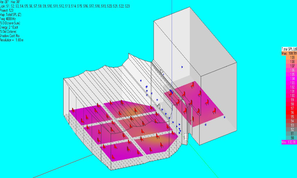 本項目系統(tǒng)較多,為了能把這次的改造工作做到盡可能的,我們認真采集現(xiàn)場房間的數(shù)據(jù)后,利用EASE4.0軟件,對影劇院的聲場擴聲進行計算機模擬輔助設(shè)計,通過音箱選型后,影劇院 的模擬設(shè)計各項指標都達到了國家相關(guān)標準《GB50371-2006》劇場類一級標準。
