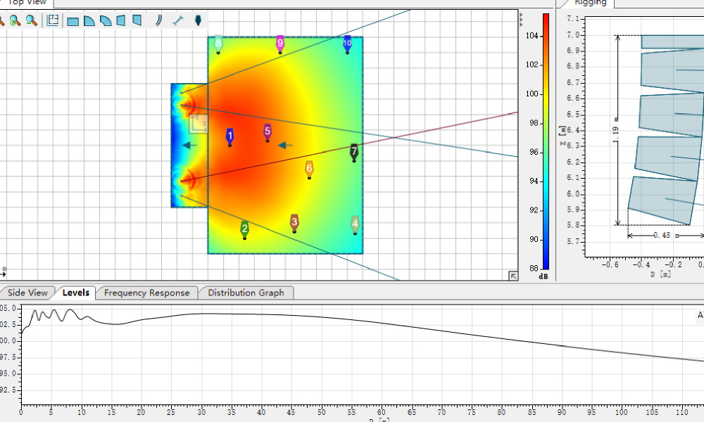 本項目的擴聲系統(tǒng)采用我國BOBaudio品牌的 線性陣列音箱組成集中供聲,在體育場的主席看臺的 左右兩邊各一組線性陣列音箱,每組音箱由4只全頻音 箱音箱組成,覆蓋整個全場,在主席臺的左右側(cè)邊各 由2只全頻音箱組成輔助補聲,覆蓋主席臺的左右側(cè)的 看臺區(qū),這樣整個體育場都被聲音覆蓋,由于線性音 箱的擴聲原理,滿足聲投射距離達到約90米遠(yuǎn)的 需求,通過測試聲壓級、語言清晰度、無線話筒的傳 輸?shù)葷M足聲場需求,我們也通過聲學(xué)EASE FOCS 軟件的輔助設(shè)計及安裝驗證。