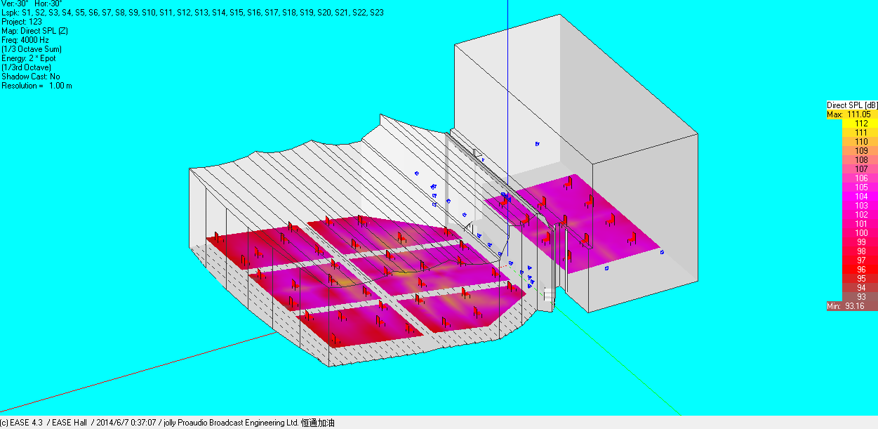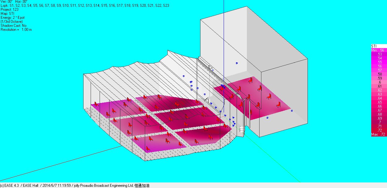 我們以文藝演出類擴聲系統(tǒng)聲學(xué)特性指標(biāo) (GB 50371-2006)一級指標(biāo)來設(shè)計音響擴聲系統(tǒng),先用計算機EASE軟件輔助設(shè)計,音箱根據(jù)我們的大量應(yīng)用案例,推薦選用美國博世(BOSCH)集團生產(chǎn)的EV 品牌中,劇場音箱EVF系列中的高解析D型音箱,來分析整個劇場的聲場。以下是具體的各個指標(biāo)分析圖: