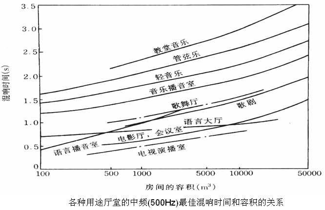 下圖給出各種用途廳堂的中頻(500Hz)更佳混響時間和容積的關(guān)系。由圖可知,廳堂的用途不同,要求的混響時間不同,且廳堂容積越大,要求的更佳混響時間也越長。