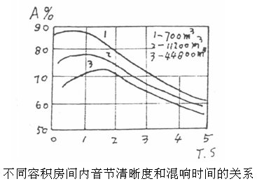 下圖給出不同容積房間內(nèi)的音節(jié)清晰度和混響時間的關(guān)系曲線。由圖可知,有相同混響時間的房間,容積越大,清晰度越低,混響時間越長,清晰度顯著降低。