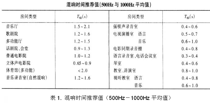 表1給出各類房間頻率為500~1000 Hz時的更佳混響時間推薦值。體積較小的房間取小值,體積較大時取大值。