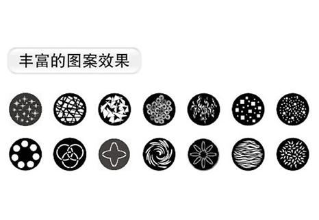 1個旋轉(zhuǎn)圖案盤,1個固定圖案盤,14個可換圖案片+白光,可安裝玻璃圖案片和金屬圖案片,可雙向變速旋轉(zhuǎn),具有索引功能,變速抖動效果、雙向變速流動效果