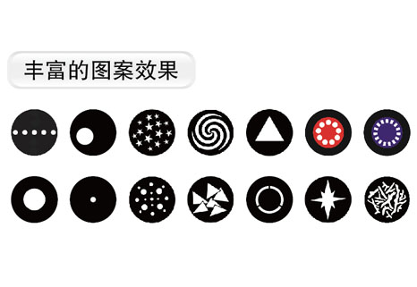 1個(gè)固定圖案盤,1個(gè)旋轉(zhuǎn)圖案盤,14個(gè)可更換圖案片(可選配),具有變速抖動(dòng)效果、雙向變速流動(dòng)效果