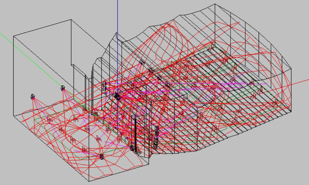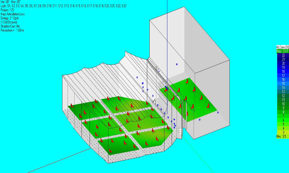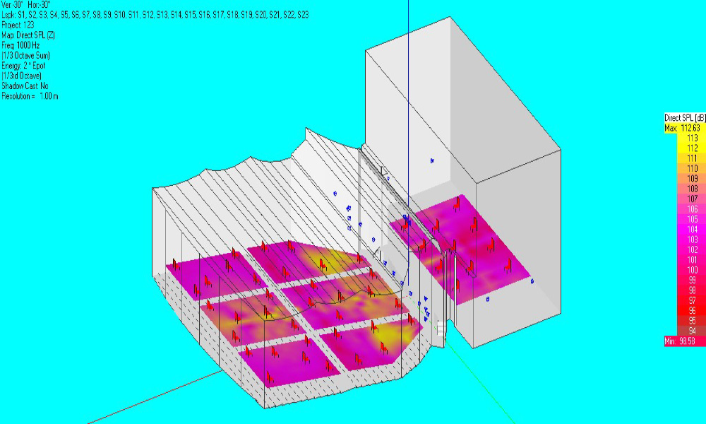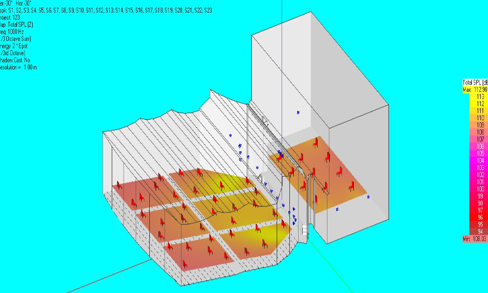 本項目系統(tǒng)較多,為了能把這次的改造工作做到盡可能的,我們認真采集現(xiàn)場房間的數(shù)據(jù)后,利用EASE4.0軟件,對影劇院的聲場擴聲進行計算機模擬輔助設(shè)計,通過音箱選型后,影劇院 的模擬設(shè)計各項指標都達到了國家相關(guān)標準《GB50371-2006》劇場類一級標準。
