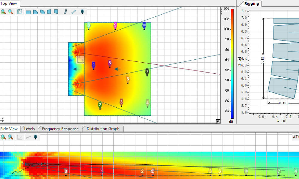 本項目的擴(kuò)聲系統(tǒng)采用美國TOPP PRO品牌的線性陣列音 箱組成集中供聲,在體育場的主席看臺的左右兩邊各一組線 性陣列音箱,每組音箱由8只全頻音箱音箱組成,覆蓋整個全 場,在主席臺的左右側(cè)邊各由4只全頻音箱組成輔助補(bǔ)聲,覆 蓋主席臺的左右側(cè)的看臺區(qū),這樣整個體育場都被聲音覆蓋, 由于線性音箱的擴(kuò)聲原理,滿足聲投射距離達(dá)到約80米 遠(yuǎn)的需求,我們應(yīng)用了EASE-Focus軟件模擬計算,并通過實 地測試聲壓級、語言清晰度、無線話筒的傳輸?shù)葷M足聲 場需求。