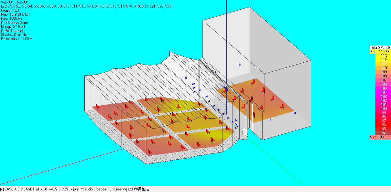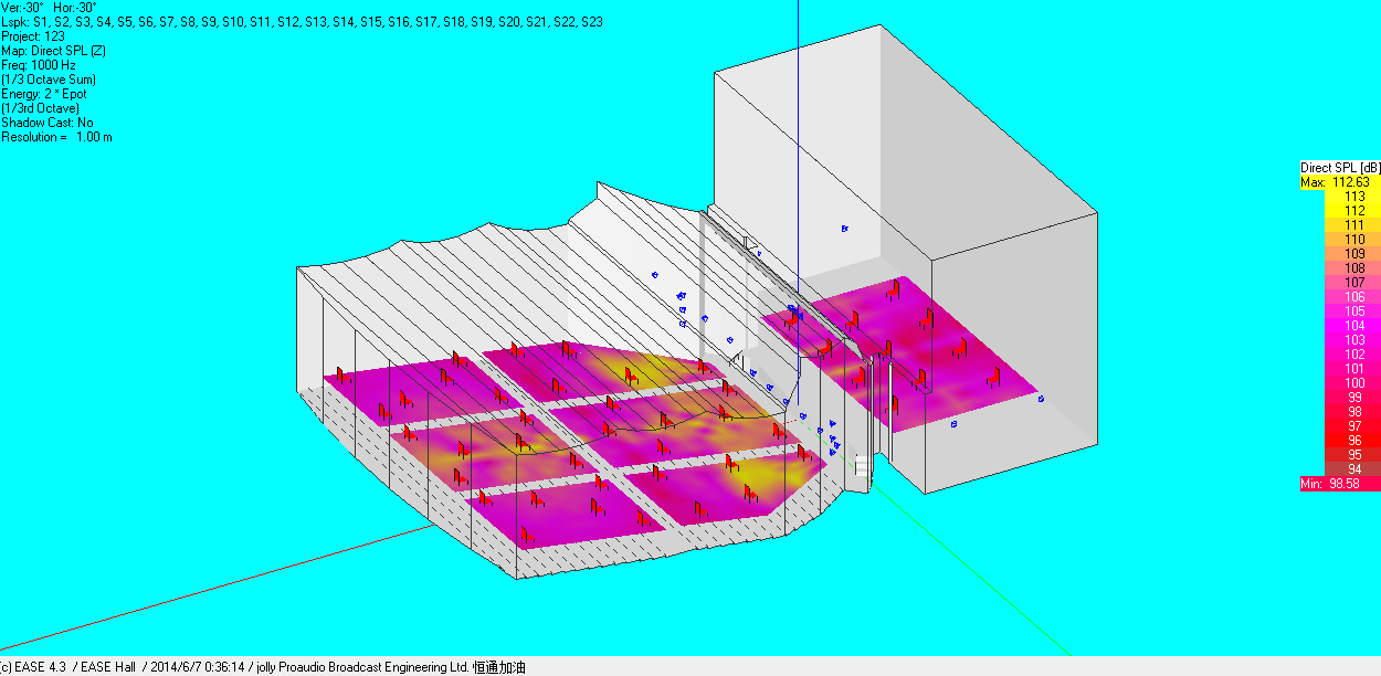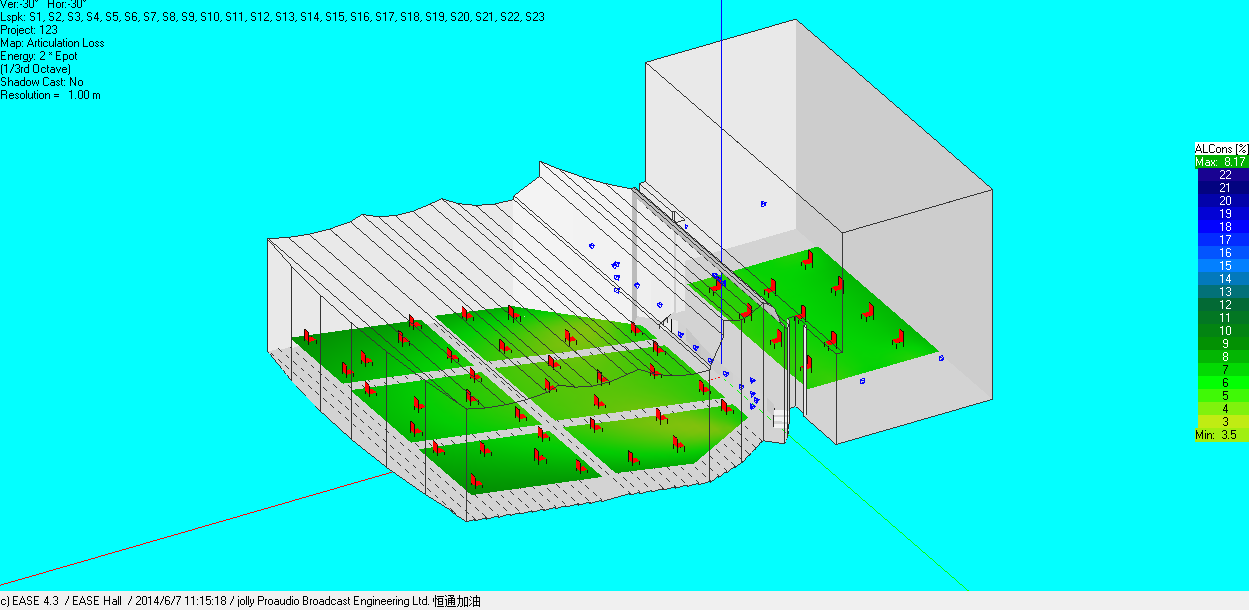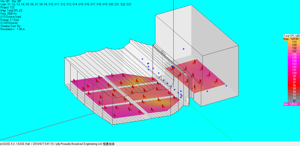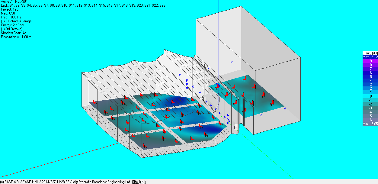 我們以文藝演出類擴聲系統(tǒng)聲學(xué)特性指標(biāo) (GB 50371-2006)一級指標(biāo)來設(shè)計音響擴聲系統(tǒng),先用計算機EASE軟件輔助設(shè)計,音箱根據(jù)我們的大量應(yīng)用案例,推薦選用美國博世(BOSCH)集團生產(chǎn)的EV 品牌中,劇場音箱EVF系列中的高解析D型音箱,來分析整個劇場的聲場。以下是具體的各個指標(biāo)分析圖: