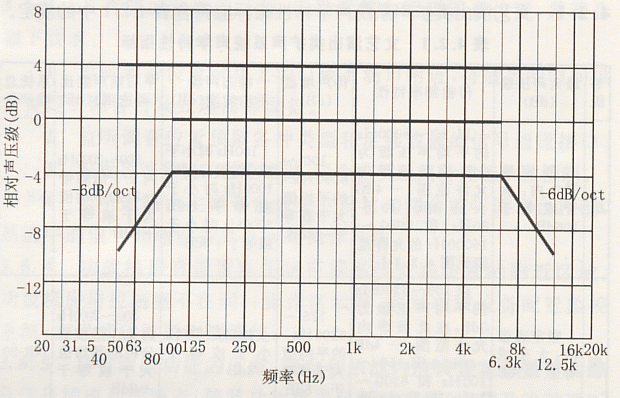 以125~4000Hz的平均聲壓級為0dB,在此頻帶內(nèi)允許范圍:-4dB~+4dB;63~125Hz和4000~8000Hz的允許范圍見下圖: