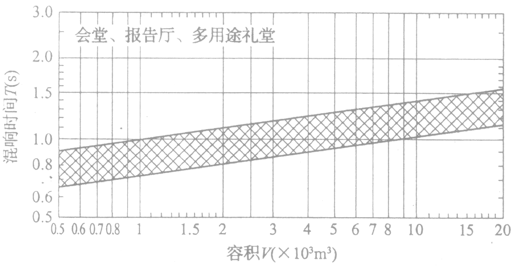 在頻率為500~1000 Hz時,對不同容積的合適混響時間,多用途廳堂宜采用下圖所示范圍:
